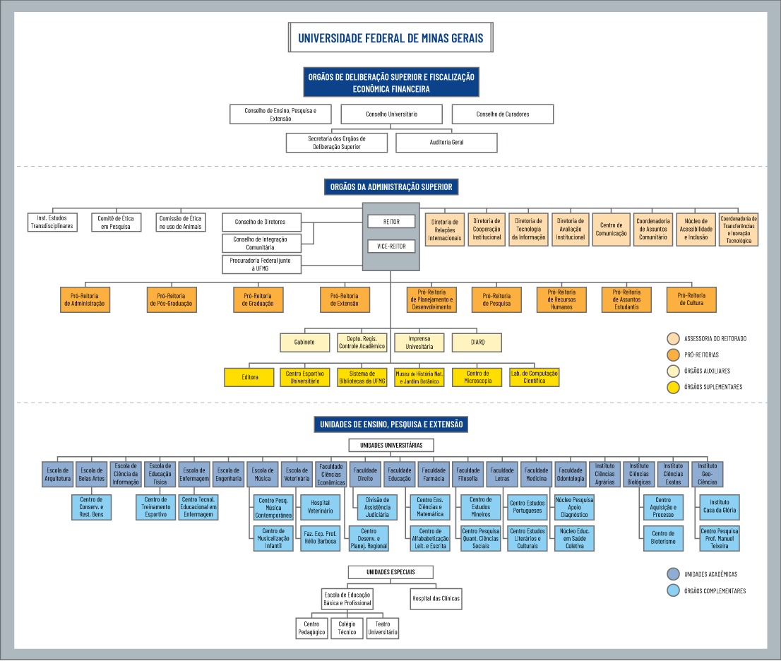 A estrutura organizacional da UFMG é composta pelos seguintes órgãos, distribuídos de acordo com suas respectivas esferas de competência: