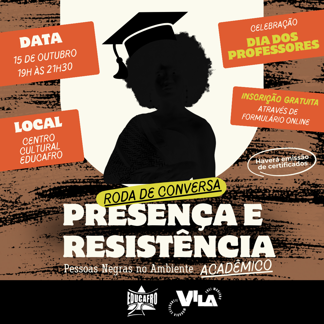 No dia 15 de outubro, das 19h às 21h30, o Centro Cultural Educafro, em Belo Horizonte, sediará uma roda de conversa intitulada Presença e resistência: pessoas negras no ambiente acadêmico, em celebração ao Dia do Professor. O evento, promovido por estudantes da UFMG, que também são moradores do projeto social Vila Frei Mariano, busca aprofundar o debate sobre os desafios e as conquistas das pessoas negras no meio acadêmico. A inscrição é gratuita, feita pelo formulário on-line.