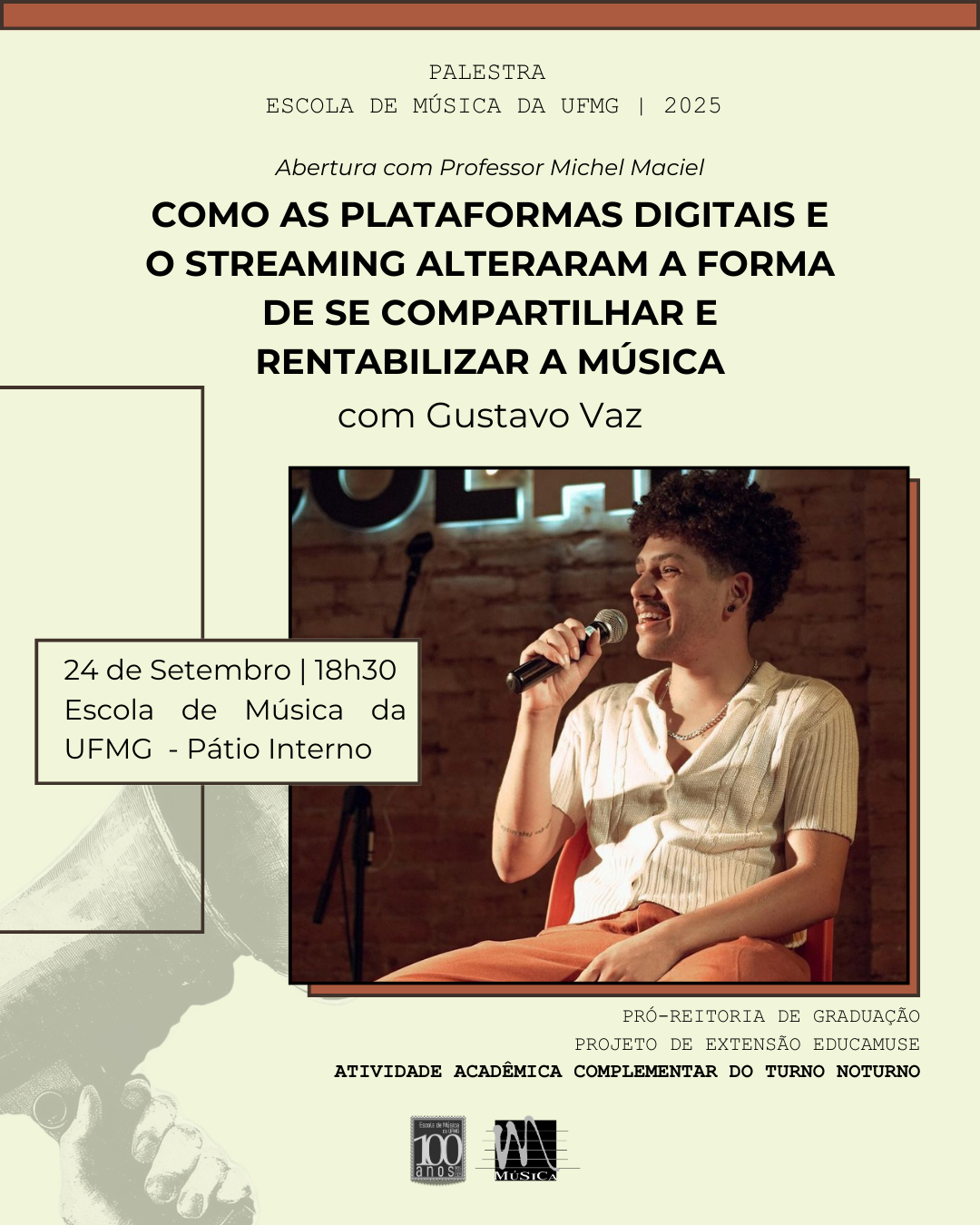 A palestra Como as plataformas digitais e o streaming alteraram a forma de se compartilhar e rentabilizar a música é organizada pelos professores Michel Maciel e Carlos Ernest Dias, da Escola de Música da UFMG, e integra o Projeto de ensino e extensão Educamuse – Ação Musical Socioeducativa. A atividade conta com apoio do Departamento de Instrumentos e Canto da Escola de Música da UFMG, da diretoria da unidade e da Pró-Reitoria de Extensão (Proex) da Universidade.