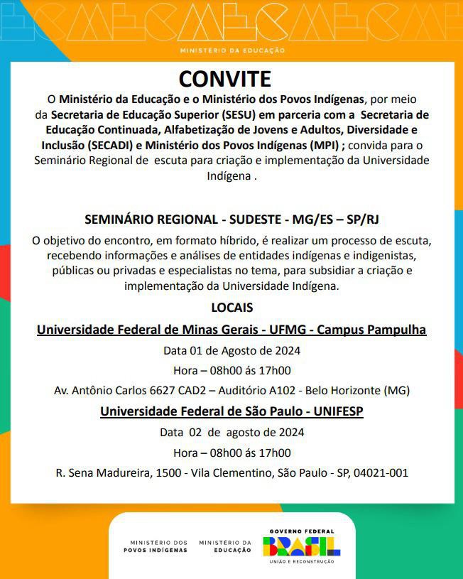 No dia 1º de agosto, a UFMG dará continuidade à série Seminário Regional de Escuta para Criação e Implementação da Universidade Federal Intercultural Indígena, que tem como principal objetivo realizar um processo de escuta, recebendo informações e análises de entidades indígenas e indigenistas, públicas ou privadas e especialistas no tema, para subsidiar a criação e implementação da Universidade Federal Intercultural Indígena.