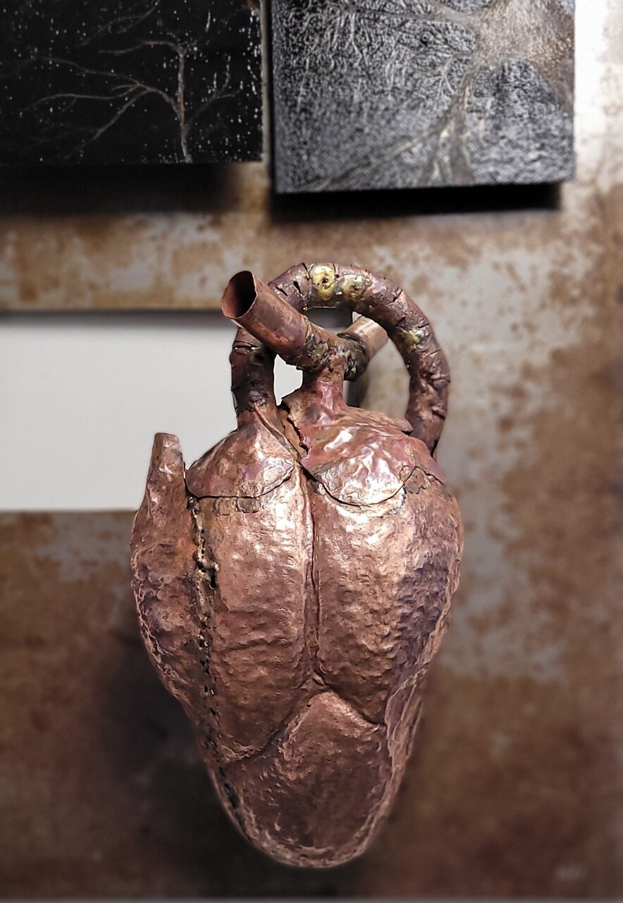 Concebida no pós-pandemia, Aeris Cor surgiu do desejo de expressar o orgânico/visceral. O trabalho nasceu como um desafio e, simultaneamente, como aprendizado de técnicas para forjar o metal. Segundo Marco Caetano, “a escultura nasceu de algo que é recorrente em minha mente: o que somos, o que possuímos por dentro, o que nos ocupa anatomicamente”.