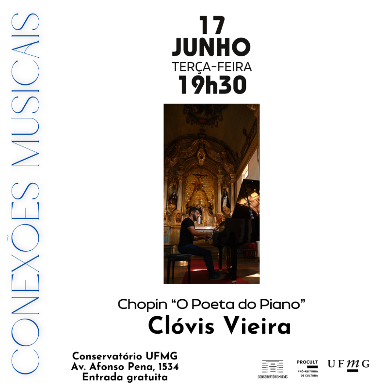O Conservatório UFMG receberá nesta terça-feira, 17 de junho, o músico Clóvis Vieira para apresentação do recital Chopin – O Poeta do Piano, em que o público será convidado a mergulhar na delicadeza, paixão e melancolia de Chopin que redefiniu a escrita pianística. O evento, com entrada gratuita, será às 19h30, dentro da série Conexões Musicais.