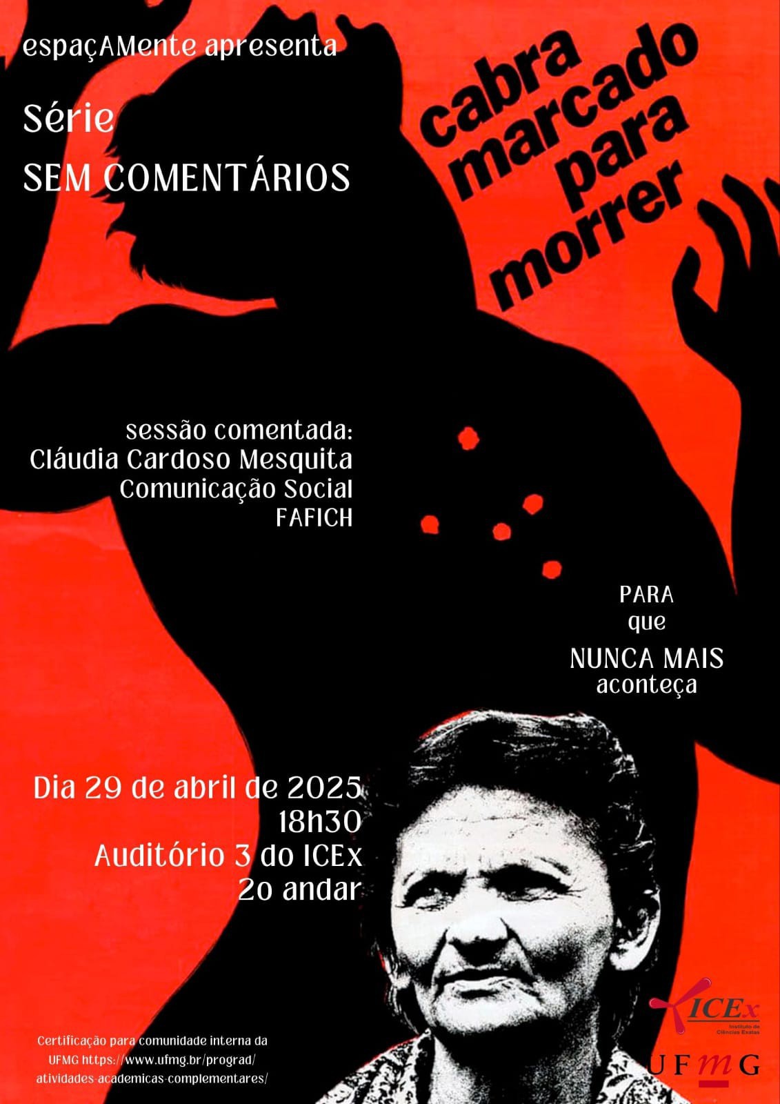 O projeto de extensão da UFMG EspaçAMente – Espaço de Acolhimento e Promoção da Saúde Mental realiza uma série de exibições de filmes ou documentários, em sessões comentadas ou não, ao longo das atividades complementares do turno noturno. A segunda sessão acontecerá no dia 29 de abril, quando será exibido o documentário Cabra Marcado para Morrer, um filme de Eduardo Coutinho, com comentários da professora Cláudia Cardoso Mesquita, do Departamento de Comunicação Social da UFMG. Todos os interessados podem comparecer ao Auditório 3 (2º andar) do Instituto de Ciências Exatas da UFMG, no campus Pampulha, às 18h30.