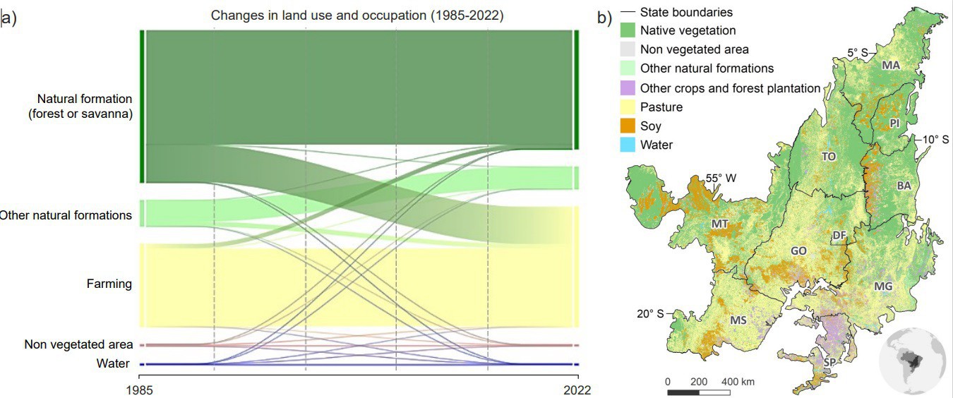 Esse agravamento das condições do clima, frequentemente associado a mudanças climáticas globais e fenômenos como El Niño e La Niña, tem causas adicionais: a destruição da vegetação nativa. Nenhuma outra savana no mundo – o Cerrado brasileiro é reconhecido como a savana mais rica em todo o território mundial – tem passado por transformações tão extensas. A vegetação nativa do Cerrado reduziu-se de 127 milhões de hectares (Mha) para 95 Mha, ao passo em que as terras agrícolas duplicaram, de 38 Mha para 77 Mha nos últimos 20 anos, de acordo com o MapBiomas. Em consequência, o estudo indica que quebras de safra estão se formando mais frequentemente em áreas severamente desmatadas, evidenciando a interdependência entre a conservação do Cerrado e a produção agrícola.
