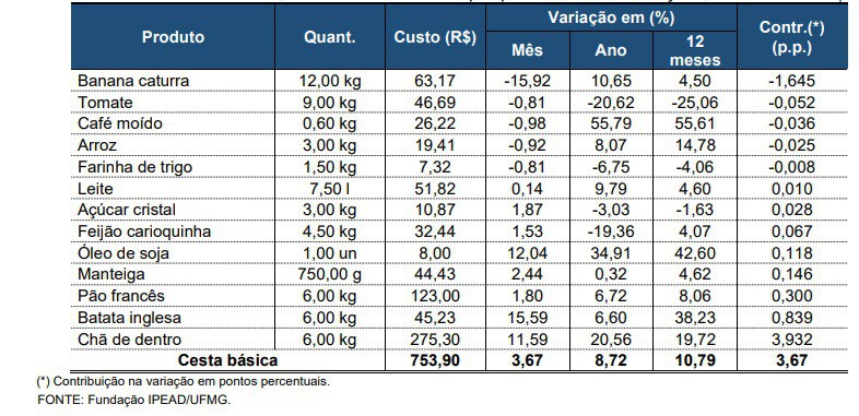 Ao se considerar a importância relativa de cada produto, os que mais contribuíram para a alta de 3,67% do custo da cesta básica em BH foram chã de dentro (3,93 p.p.), batata inglesa (0,84 p.p.) e pão francês (0,30 p.p.). No ano, o item com maior variação positiva é o café moído (55,79%) e o item com a maior variação negativa é o tomate (-20,62%).