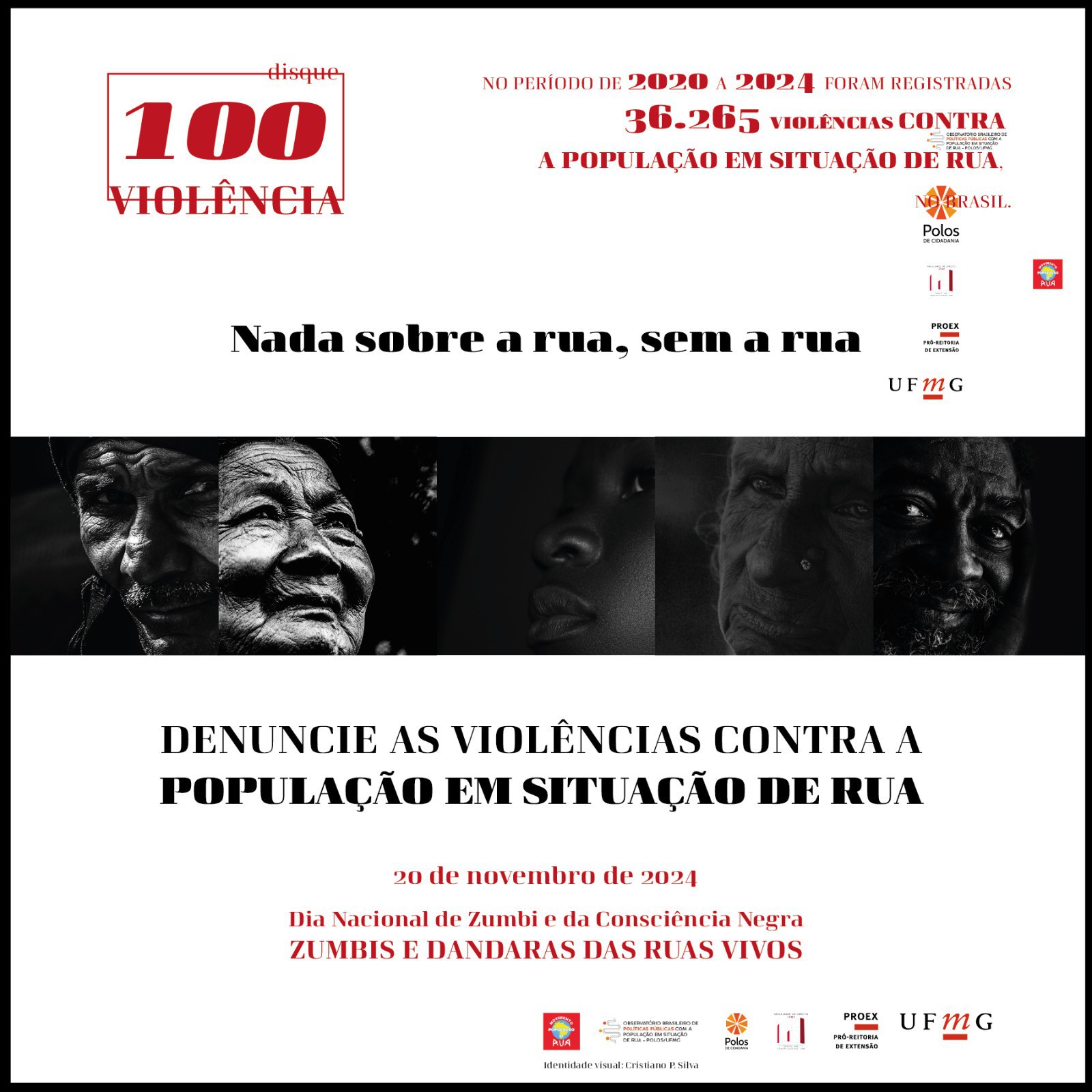 Até a próxima segunda-feira, dia 25 de novembro, serão divulgados dados de violências cometidas contra as pessoas em situação de rua, coletados e analisados a partir de registros do Disque 100, no período de 2020 a 2024. Nesse período, foram 36.265 violências praticadas e registradas contra a população em situação de rua, majoritariamente negra, que tem os seus direitos, previstos na Constituição Federal de 1988, sistematicamente ameaçados e violados no país. A divulgação dos dados teve início no dia 20 de novembro, uma ação da campanha 100 violência, realizada pelo Observatório Brasileiro de Políticas Públicas com a População em Situação de Rua (OBPopRua), do Polos de Cidadania da UFMG, e pelo Movimento Nacional da População em Situação de Rua.