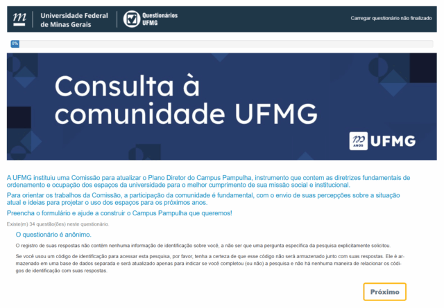 O formulário conta com três grupos de questões. Inicialmente, é feita a caracterização do participante, sem a sua identificação. O segundo grupo de questões aborda a visão que o participante tem do campus Pampulha, e o terceiro, as necessidades de mudança que ele vê no espaço. O formulário pode ser acessado pela internet e respondido on-line por estudantes, professores, servidores técnico-administrativos e profissionais terceirizados. É importante que todas as categorias participem, para que o novo plano atenda às necessidades dos diferentes grupos que frequentam o campus.