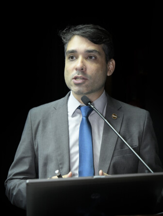 Hugo Valadares, de terno cinza e gravata azul, fala ao microfone
