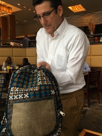 O professor Álvaro Eiras exibe mochila feita para espalhar o repelente